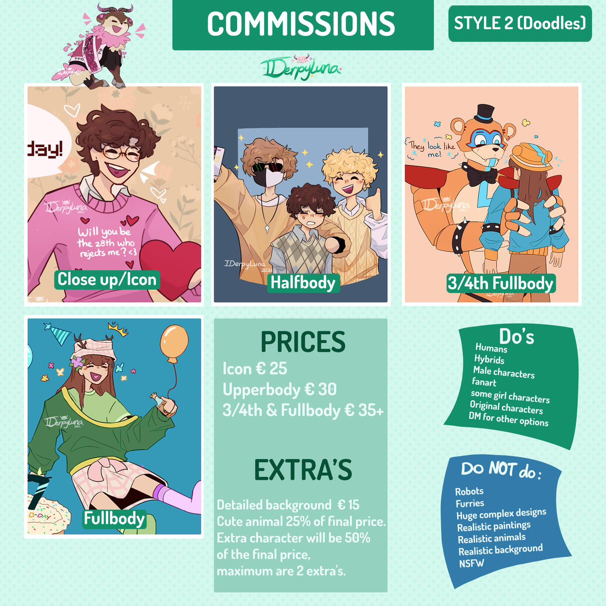♦ My art is only for personal use.♦ If there is anything you want to do that's not on the list, we can always discuss the idea.♦ I am allowed to decline a request if I cannot or don't want do it.♦ I am able to use this commission to promote myself, post it on my social media with a commission watermark and record the progress.♦ If the commission gets stolen by a company, business or anyone and used commercially, I will not blame it on you and will try and help you in the situation to resolve this.♦ Do not edit my work.♦ Commissions can take up to 2-3 months, depending how busy school is and what I am doing for content.♦ My style can change a bit during the process, bear with me.♦PAYMENT♦♦ Payment via Paypal, iDeal or anything supported by Paypal.♦ You agree that you will pay the full price before I send in the final product and that you will not back out last minute.♦ When paying any amount you agree to work together and that there will be no refund.♦ Payments are done in Euro. Keep your currency in mind while commissioning, the prices can go up or down depending on that.♦USAGE OF♦♦ You agree with never using my artwork for your own financial gain and used by a third party. (Usage of emotes and PNG Tubers are an exception, because it is for personal use.)♦ You have the rights to use the artwork on your social platforms as personal use (posting it, using it as your profile picture, forums etc. , print the artwork for personal purposes and share it with others.)♦ You have the choice to share the commission artwork with or without the commission watermark. So does IDerpyLuna.♦ You agree on never reproducing/using the artwork commercially without discussion. (I am allowed to decline the offer and if I accept, ask for a commercial fee.)♦COPYRIGHT♦